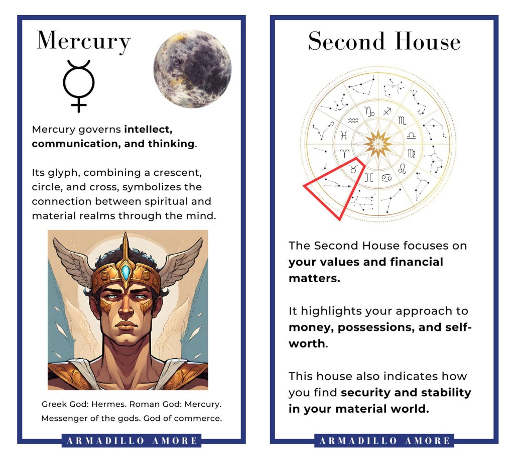 People with Mercury in the Second House often have a talent for using words or ideas to generate income. They may find success in fields like writing, teaching, marketing, sales, or finance—anywhere that allows them to monetize their intellect. These individuals are often resourceful and clever with how they manage money or possessions. They can be good at budgeting, spotting valuable opportunities, or negotiating deals.