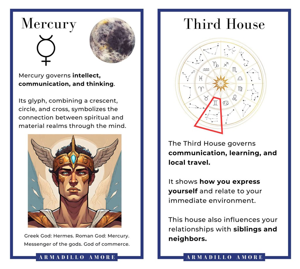 Ultimately, Mercury in the Third House is a placement of the thinker, the messenger, and the connector. These individuals are often at their best when they’re exploring ideas, learning new skills, and sharing what they know. They bring an agile, lively presence to any conversation—and often leave others inspired, informed, or at least curious to know more.
