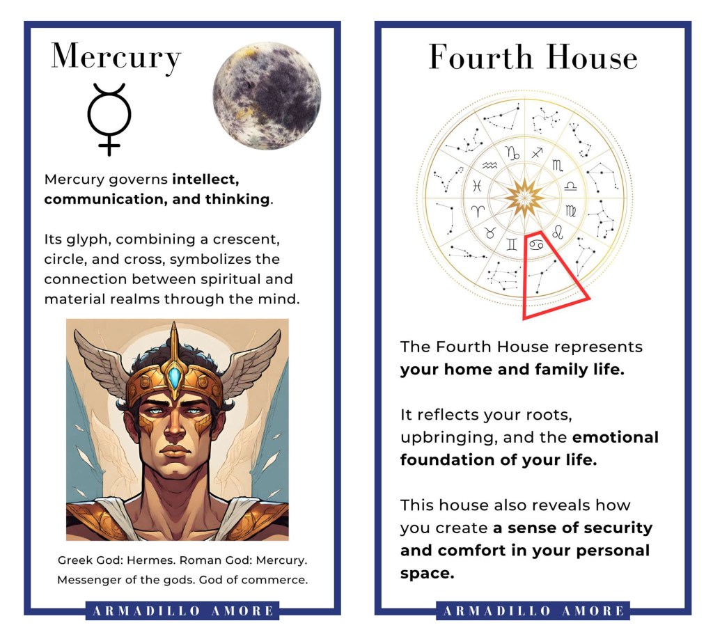 At its best, Mercury in the Fourth House gives a thoughtful, emotionally intelligent communicator who understands the power of words to heal, connect, and honor the past. This placement supports a strong inner voice, one that finds truth not just in logic, but in the stories we carry—and the ones we choose to rewrite.