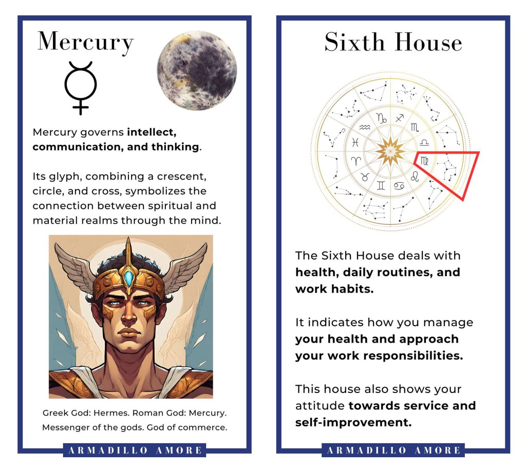 Mercury in the Sixth House channels the planet of communication, analysis, and mental agility into the domain of daily work, routine, health, and service. This is a placement that favors precision, order, and efficiency. The Sixth House is about how we manage the small but essential details of life—our habits, our work ethic, and the way we take care of our physical and mental well-being. When Mercury is placed here, it brings a sharp mind to these areas.