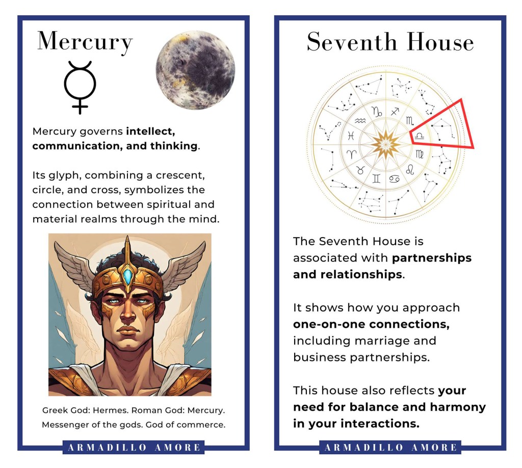 Mercury in the Seventh House places the planet of communication, intellect, and curiosity into the sphere of partnerships, one-on-one relationships, and public interactions. The Seventh House governs marriage, business partnerships, open enemies, and how we relate to others in close, balanced relationships. When Mercury is here, it emphasizes the importance of dialogue, negotiation, and mental connection in relationships.