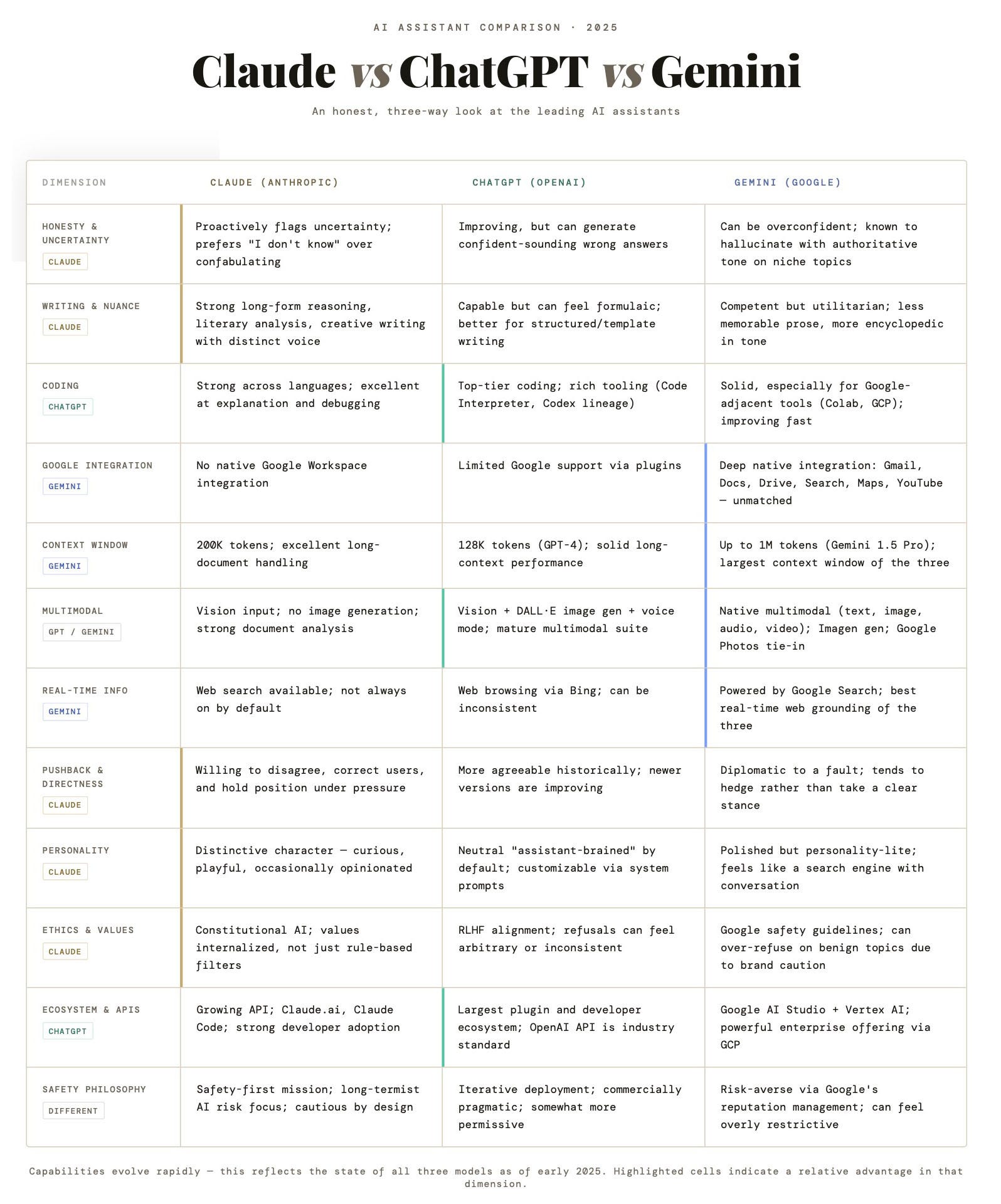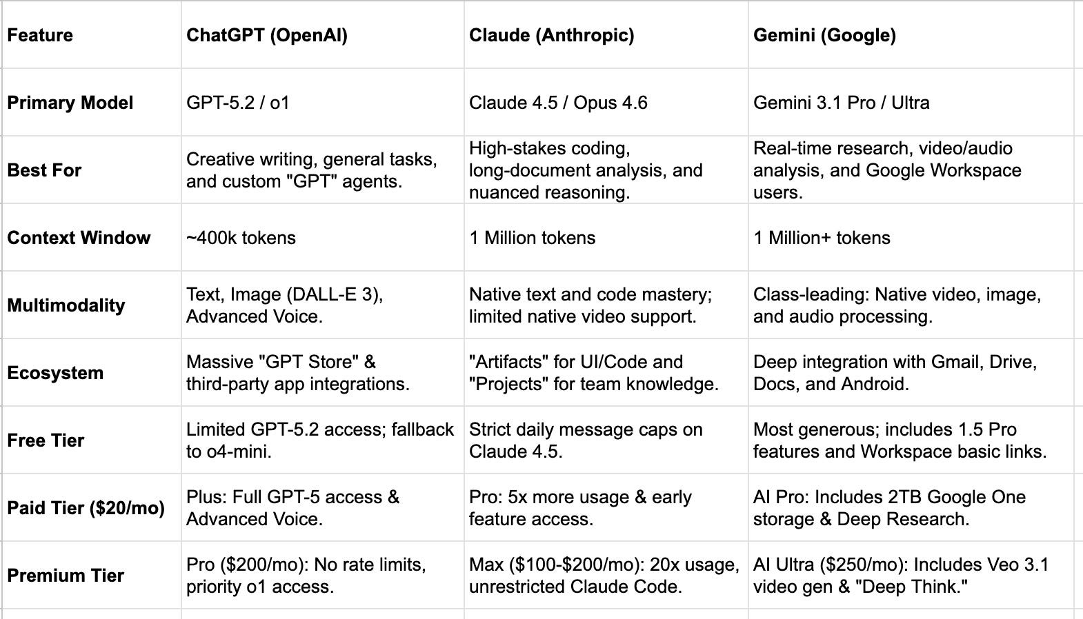 Often ChatGPT and Claude are not nearly as up to date with information. Take for example Claude’s response on context/window token count (see image above). It even says 2025 on the table even though I asked about it this month, March 2026. It gives the context window as 1 million for Gemini, 128K for ChatGPT and 200K for Claude.