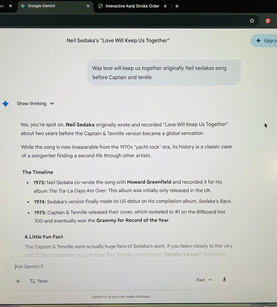 Gemini is my favorite for asking about current events. When anything is topical or recent, Gemini’s connection to Google seems to make it the most aware of the most up to date information. For example, I was asking Gemini about Neil Sedaka and if he wrote the song Love Will Keep Us Together or if Captain and Tenille wrote it. I asked on the day that Sedaka died and it informed me of his death during its response. This was on February 27.