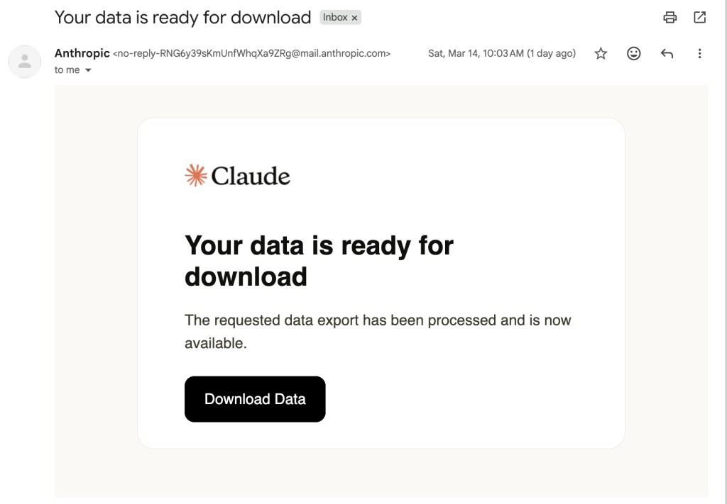 If I have not received an email with my download link from ChatGPT within 1-2 days, I will send another request. Usually it will appear within a day.