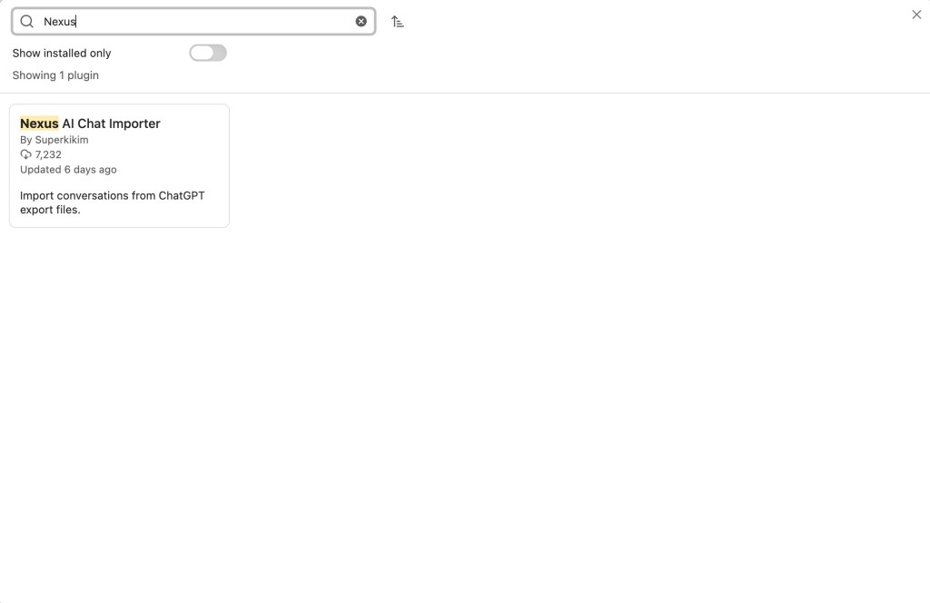 Once you have your vault setup, go to Settings, turn on Community Plugins if necessary, click Browse, and search for Nexus AI Chat Importer. Download and enable the plugin.