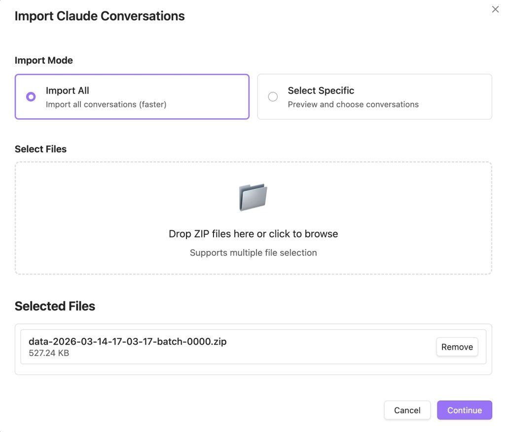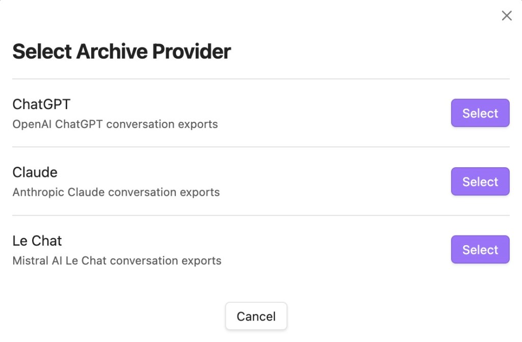 After access via the sidebar or command palette, you will be asked to Select the Archive Provider. Here you can choose to import from ChatGPT, Claude, or Le Chat* (see footnote).