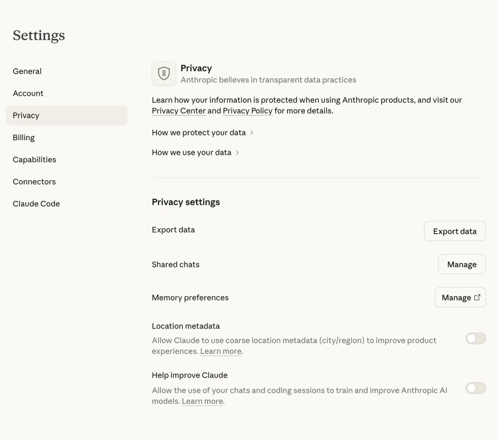 For both ChatGPT and Claude, the first step is to go to the settings in the bottom left corner on a web browser. On ChatGPT, click on Data Controls. On Claude, click on Privacy. (For Claude, you can also go directly to the url https://claude.ai/settings/data-privacy-controls)