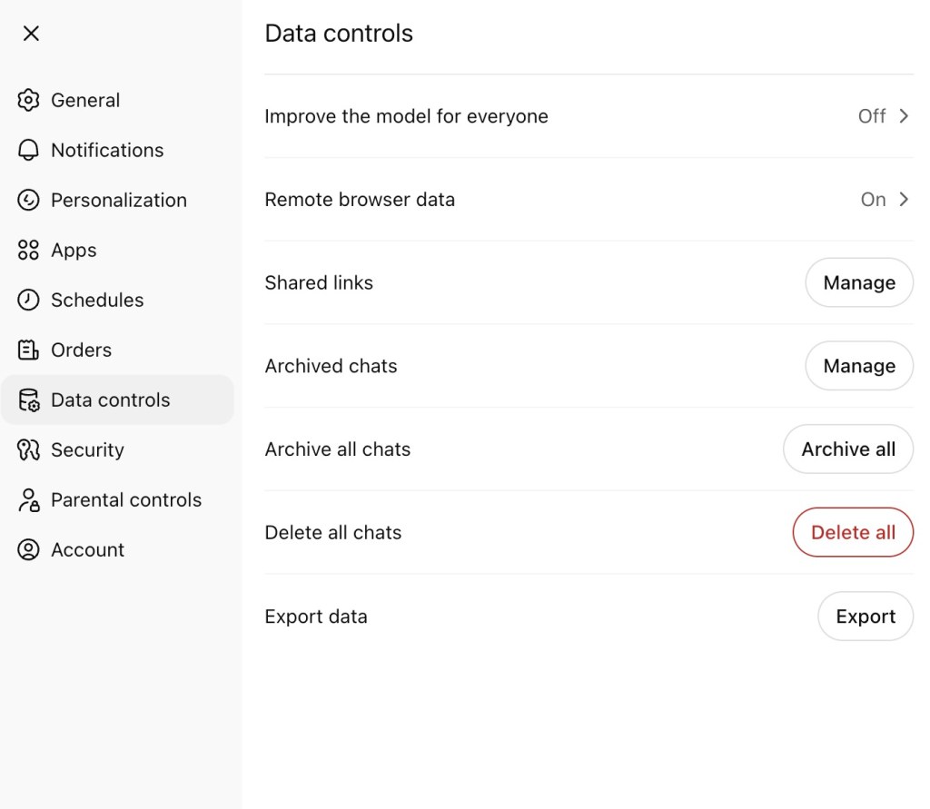 In this manner, I have a copy of every conversation for my own records and they no longer exist purely on the AI provider’s server. Every week or two, I delete all my chats and start with a fresh slate.
