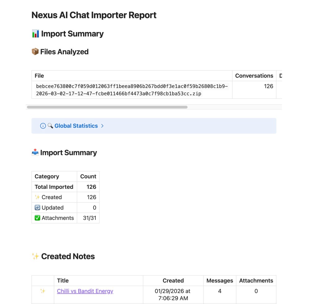 The plugin generates a separate note in the reports folder that explains what has been imported. See image below.